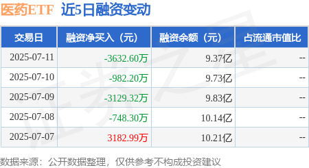 本站消息,7月11日,医药ETF(512010)融资买入1.98亿元,融资偿还2.34亿元,融资净卖出3632.6万元,融资余额9.37亿元。