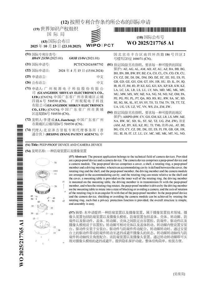 证券之星消息,根据企查查数据显示视源股份(002841)公布了一项国际专利申请,专利名为“一种防窥装置以及摄像装置”,专利申请号为PCT/CN2024/087792,国际公布日为2025年10月23日。